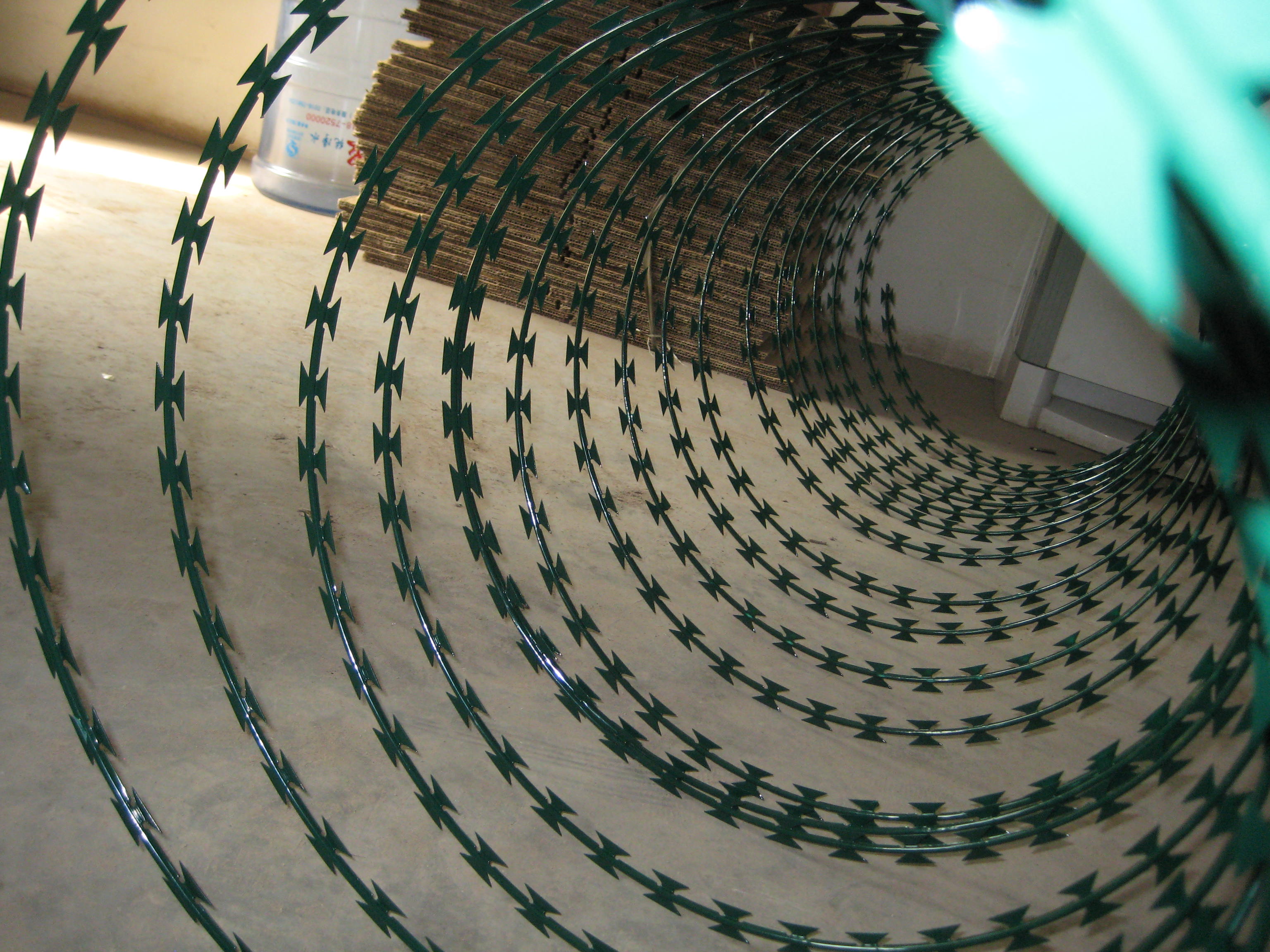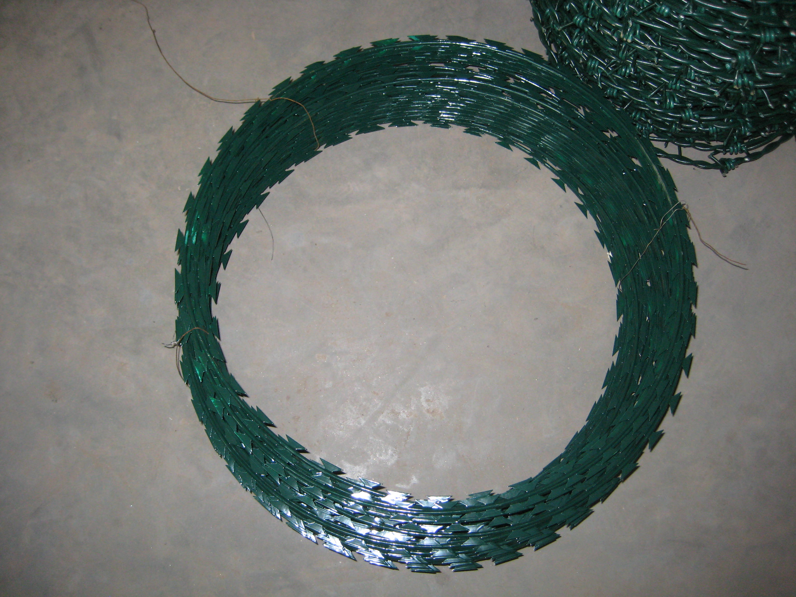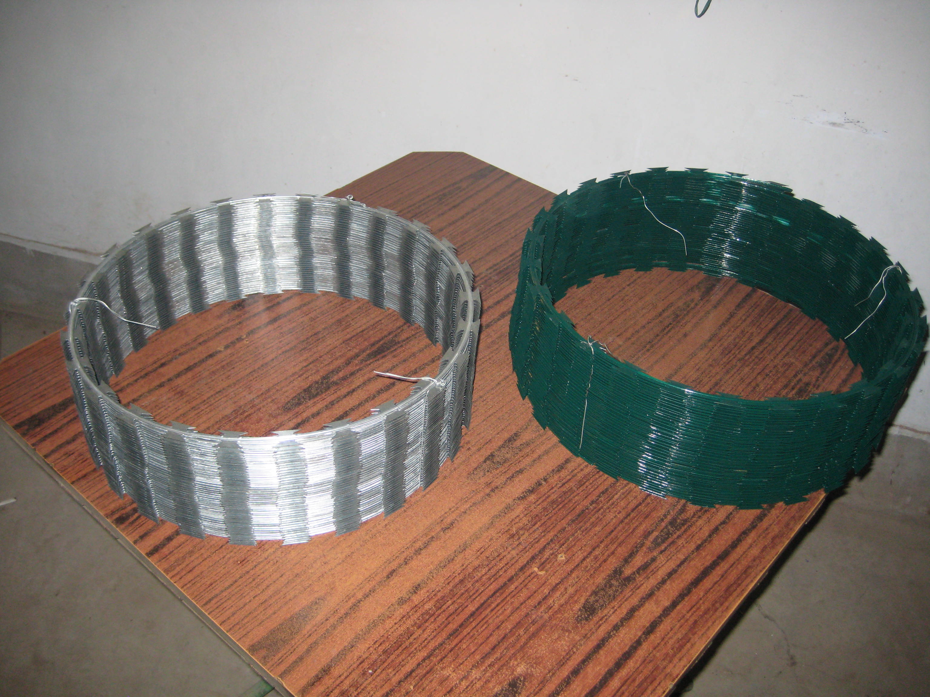 刀片刺網(wǎng)也習(xí)慣被大家稱作蛇腹形刀片刺網(wǎng),因?yàn)槠湫螤钕褚粭l蛇。雙螺旋刀片刺網(wǎng)與單螺旋刀片刺網(wǎng)的最大區(qū)別:相鄰的兩根刺繩用卡扣固定,拼接在一起的刀片刺網(wǎng)展開后,交叉在一起。更大程度上減少了刺繩之間的間隙,防護(hù)效果大大提升。
